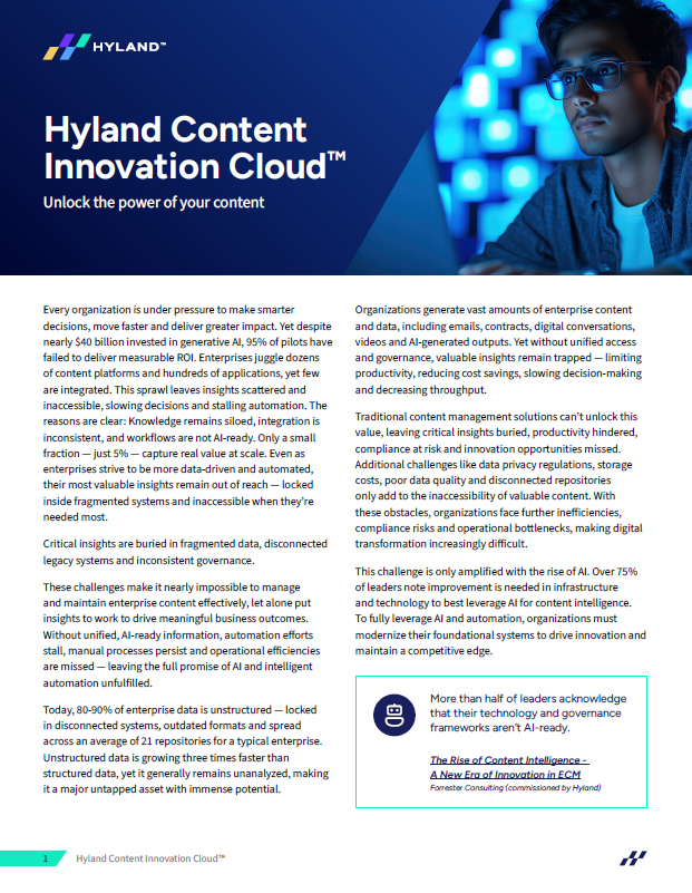 The most successful organizations are already transforming how they manage their enterprise content — moving to cloud-native platforms for scalability and cost savings, breaking down content silos to unify information across the enterprise, and using AI and intelligent automation to worker smarter, faster and more efficiently.